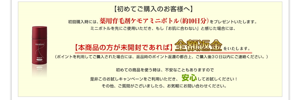 初めてケモアを使う方にはミニボトルが付いてきます。ミニボトルを使用して自分に合わない、または効果を感じられない場合はケモアを返却して頂くと購入金額が全額返金されるので気軽に試す事が出来ます。