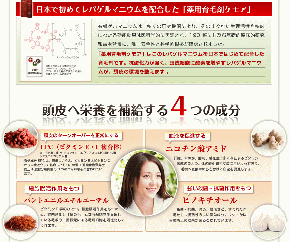 薬用育毛剤のケモアには、頭皮のターンオーバーを正常化する「ビタミンE・C複合体」や、血流を促進する「ニコチン酸アミド」、細胞の活性化を促す「パントテニルエチルエーテル」、そして、抗菌作用がある「ヒノキチオール」の4つの有効な栄養成分と、体内に酸素は運ぶ事でエネルギーを生み出し、体内の毒素を排出する働きがある「レパゲルマニウム」が配合されている事で、毛母細胞が活性化するために必要な栄養と酸素を頭皮に与え、育毛・発毛効果がある事が特徴です。